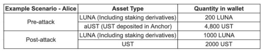 Разработчики попытались объяснить схему аирдропа на примере. Допустим, Алиса хранила LUNA на депозите в протоколе Anchor. Вот как выглядел ее кошелек в период до атаки на TerraUSD и после: