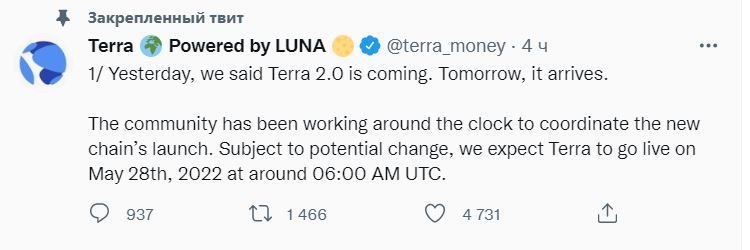 На фоне провала попыток возродить платформу, разработчики приняли решение создать версию Terra 2.0. В официальном микроблоге проекта говорится о том, что перезапуск платформы состоится 28 мая 2022 года в 06:00 AM UTC (в 9 утра по Москве). Первую версию Terra, при этом, разработчики планируют, по аналогии с Ethereum и Ethereum Classic, переименовать в Terra Classic.