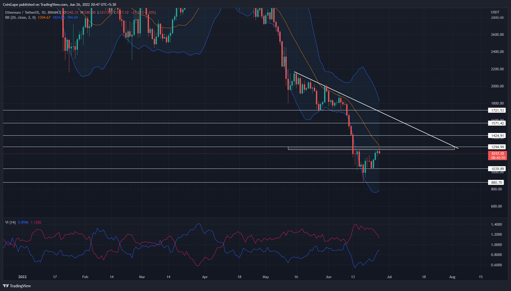 Однако линии VI+ и VI- индикатора вихря, сближающиеся друг с другом, указывают на потерю медвежьего импульса. Это говорит о том, что покупателям удастся защитить поддержку в 1000 долларов.