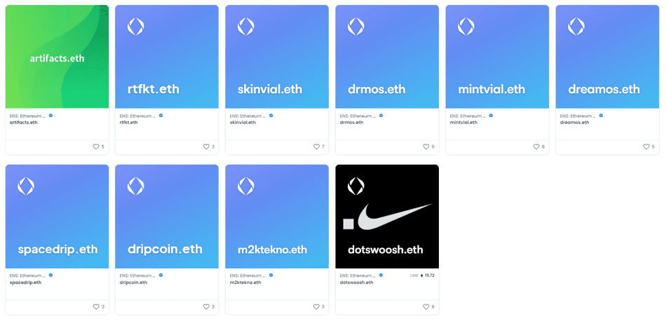 Помимо dotswoosh.eth, RTFKT также владеет artifacts.eth, rtfkt.eth, skinvial.eth, drmos.eth, mintvial.eth, dreamos.eth, spacedrip.eth, dripcoin.eth, m2tekno.eth.