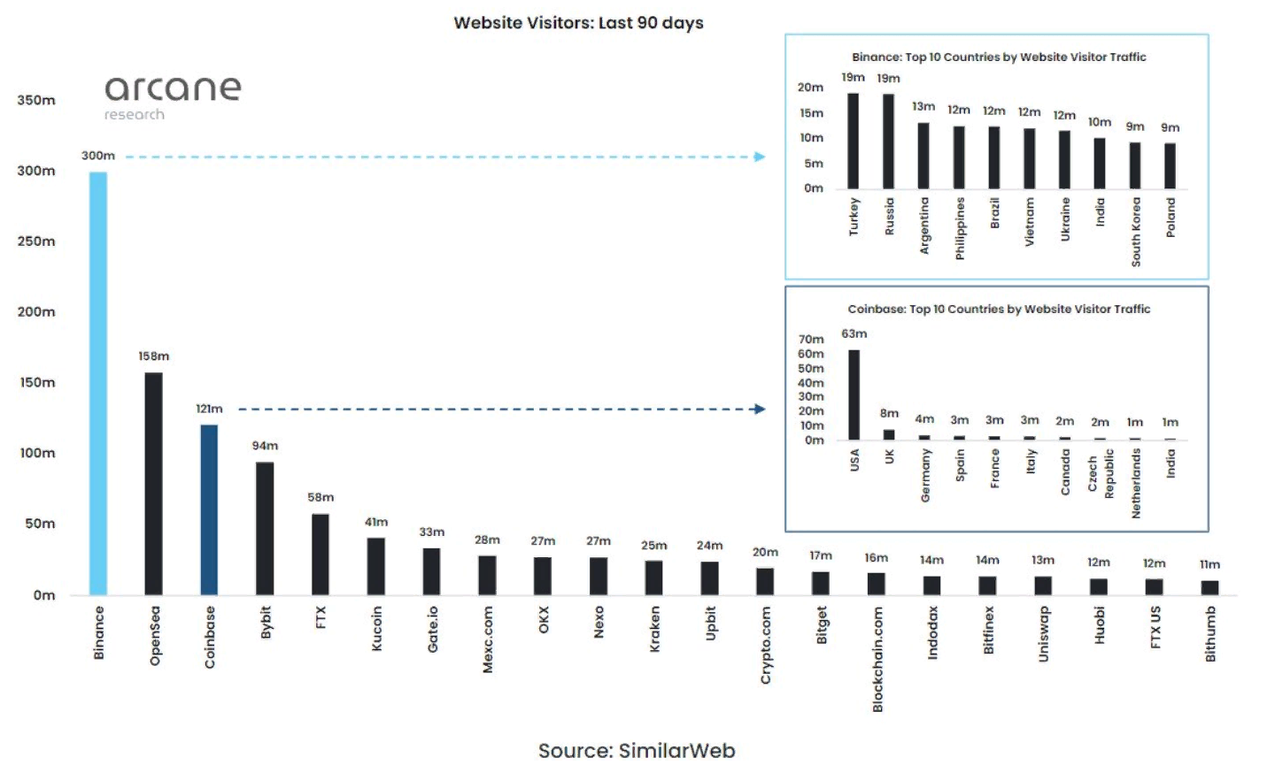 Второе место занимает Coinbase. Сайт этой торговой площадки посетили за месяц 121 млн интернет-пользователей, выяснили исследователи.